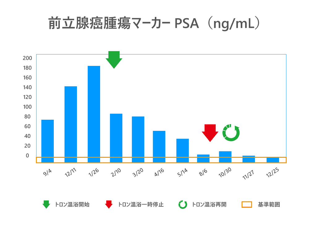 ・しかし、一時的にトロン入浴を中断するとPSAが上昇し(赤矢印)、再開すると再び低下し、基準範囲内に収まり続けた。