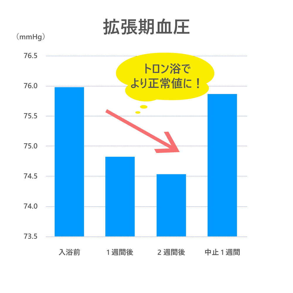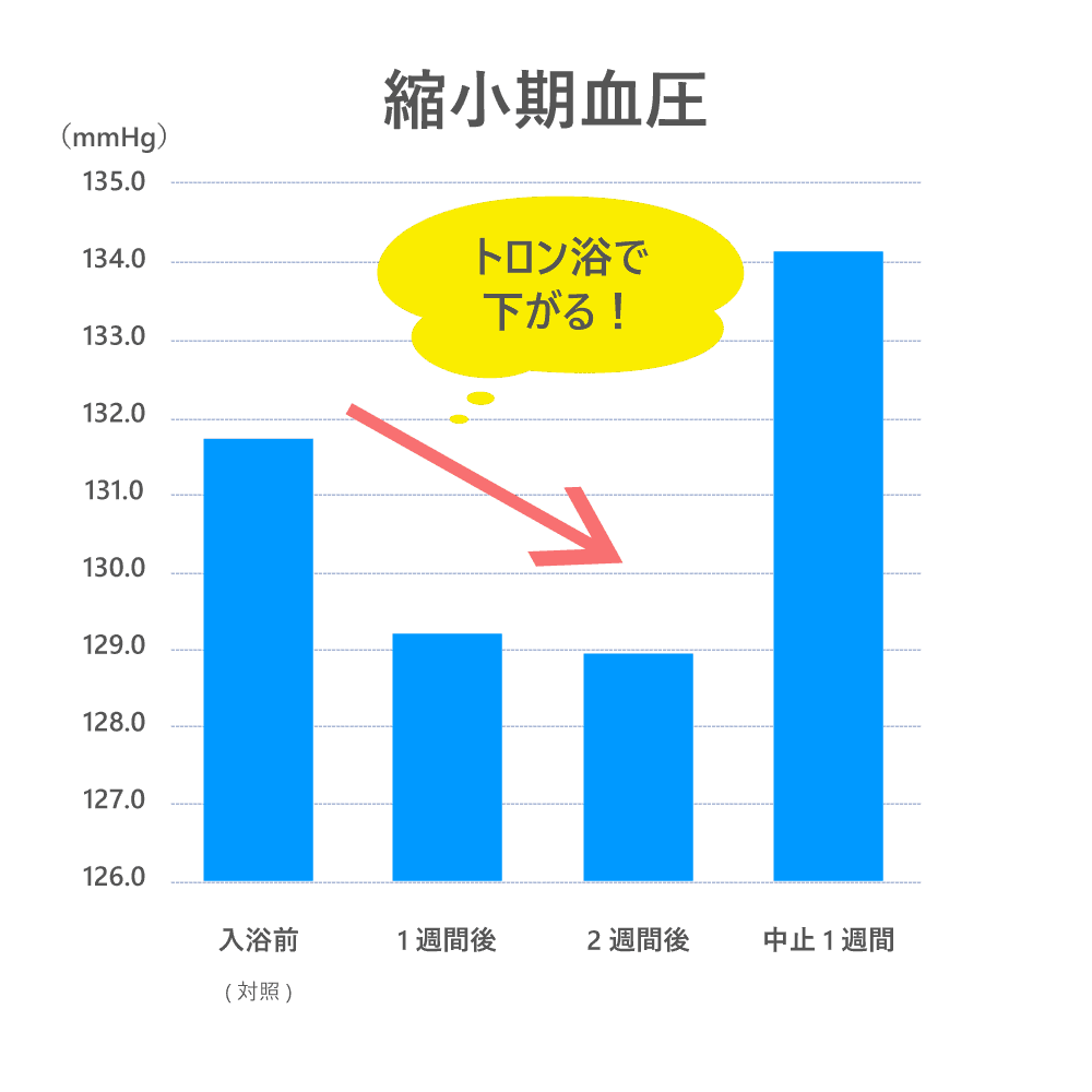 高血圧は、脳卒中などの最大の危険因子です。脳卒中などの予防や治療には、血圧のコントロールが不可欠です。血圧には、心臓が血液を押し出すときの高い方の血圧(収縮期血圧)と、心臓が拡張したときの低い方の血圧(拡張期血圧)があります。収縮期血圧130mmHg以上、拡張期血圧85mmHg以上でリスクが高まるといわれています。トロン浴をする前に比べると、どちらもトロン浴開始1週間後、2週間後と徐々に血圧が低下する傾向があることがわかりました。