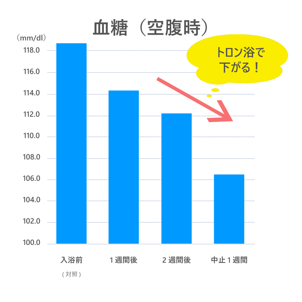 血糖値が110mg/dl以上の高い状態が続くと糖尿病のリスクが高まります。糖尿病は放置すると、人工透析が必要になったり、失明することもあるなど、あなどれない病気です。トロン浴を続けると高かった血糖値が下がり、さらにトロン浴を中止しても、しばらくは低いままでした。