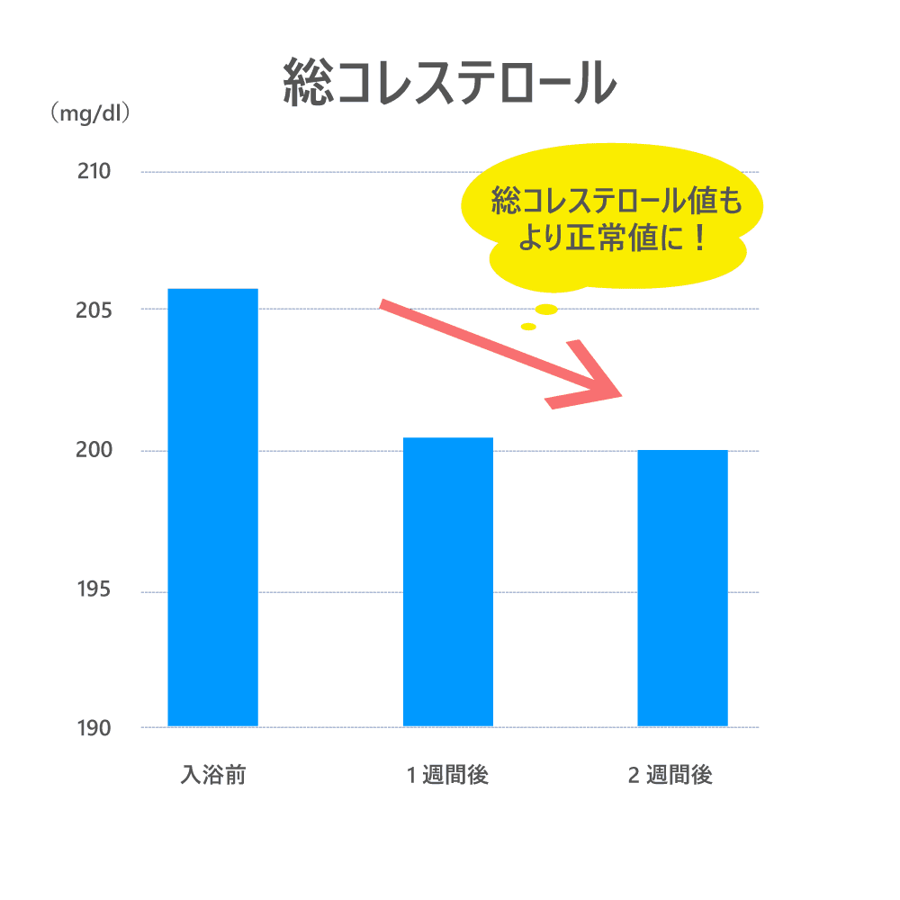 血液中のコレステロールが220mg/dl以上に増えすぎると、動脈硬化の原因となり、虚血性の心臓病や脳卒中を引き起こす危険性が高まります。トロン浴を続けると、総コレステロール値が下がる傾向があることがわかりました。