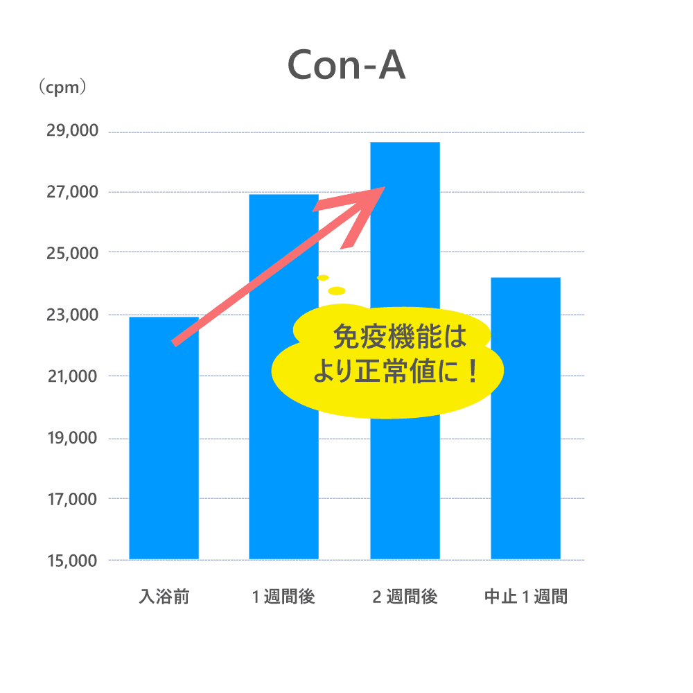 免疫システムには、たとえば発生したがん細胞を見つけて攻撃し、増えるのを防ぐ働きがあります。その免疫システムを調べる方法にCon-Aを用いた検査があります。トロン浴を続けると、免疫システムの働きが高まる傾向にあることがわかりました。