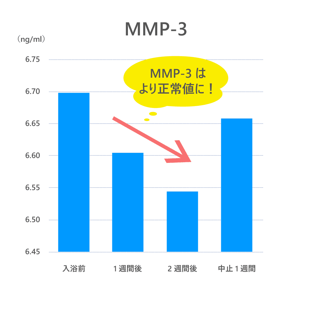 節リウマチは自分の免疫システムに異常を来たし手関節などを破壊し、痛みや腫れを起こす病気です。関節リウマチの早期診断に血液中のMMP-3を調べる検査があります。関節の膜が壊れると現れ、MMP-3の高い(男性121ng/ml以上、女性60ng/ml以上)人ほど、関節破壊の進行が速く、治療が難しくなりがちといわれています。トロン浴を続けると、このMMP-3が下がることがわかりました。