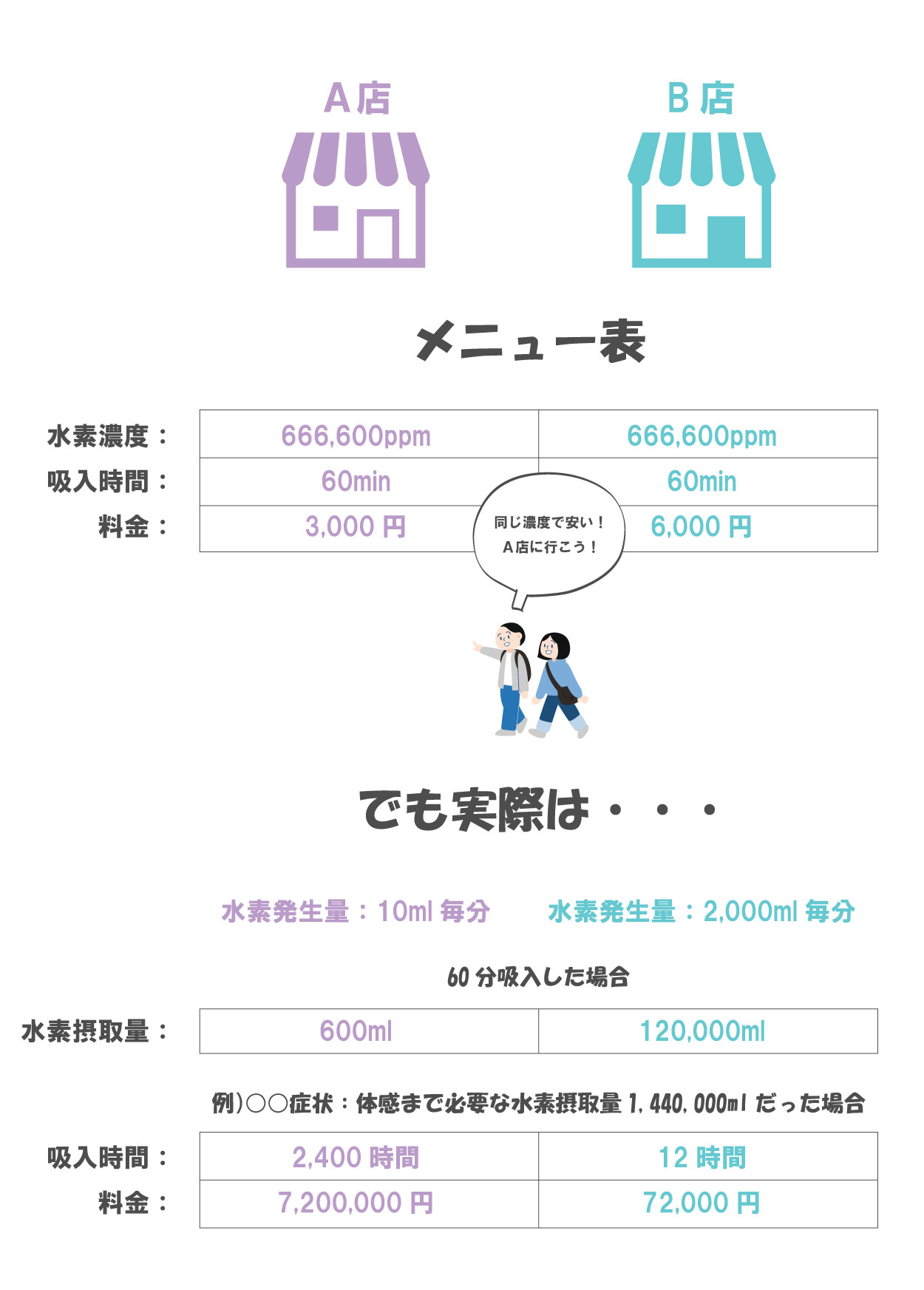 メニュー表を見ると、A店の方が料金が安く、お得に感じると思います。しかし、A店で摂取できる水素量は極めて少なく、体感するまで相当時間を要してしまいます。それをあまり知らない利用者が「水素吸入には効果がない」というような否定的な意見を持ってしまうのです。