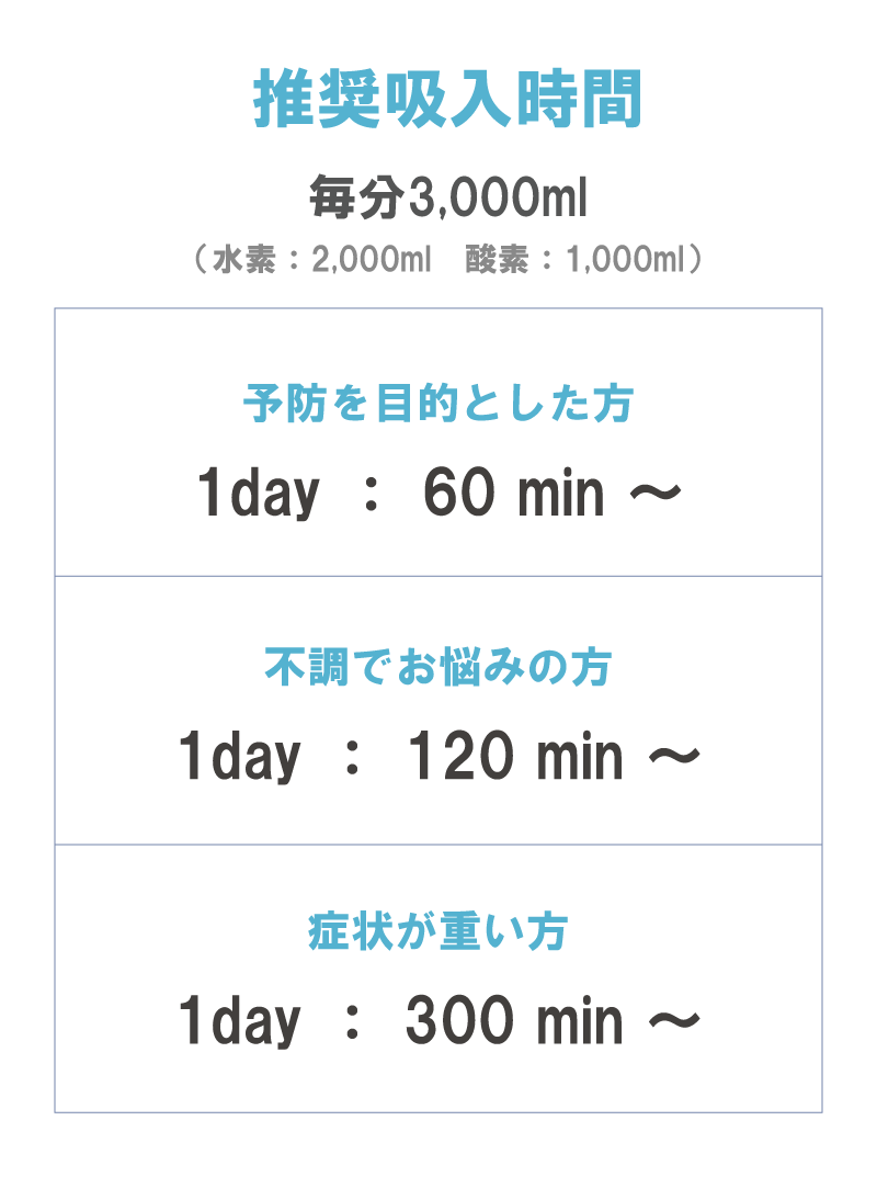 少量でも吸入することでメリットはありますが、水素量が少なすぎると、早期に効果を求めることはとても難しく、かなりの時間を要します。求める効果に対し、相応のスペックを持つ機器で吸入することが大切で、高スペック機器であっても、マメに吸入を継続して初めて得られる効果もあります。